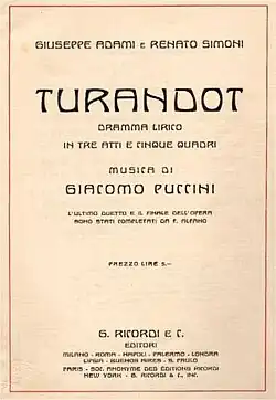Turandot (Italian pronunciation: [turanˈdo][1][2] or, prescribed, [turanˈdɔt] ⓘ;[3][4] see below) is an opera in three acts by Giacomo Puccini to a libretto in Italian by Giuseppe Adami and Renato Simoni. Puccini died in 1924, and his opera was left unfinished. The music was completed by Franco Alfano and premiered on 25 April 1926, almost a year and a half after Puccini's death.[5] The opera is set in China and follows the Prince Calaf, who falls in love with the cold-hearted Princess Turandot.[6] In order to win her hand in marriage, a suitor must solve three riddles, with a wrong answer resulting in his execution. Calaf passes the test, but Turandot refuses to marry him. He offers her a way out: if she is able to guess his name before dawn the next day, he will accept death.