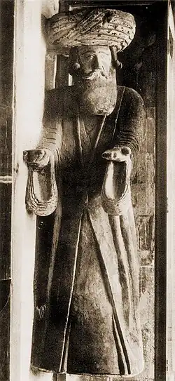 The earliest depiction of a turban can be found on a Mesopotamian sculpture dating back to 2350 BCE.[6][7][8][9] A style of turban called a phakeolis continued to be worn in that region by soldiers of the Byzantine army in the period 400–600,[10] as well as by Byzantine civilians as depicted in Greek frescoes from the 10th century in the province of Cappadocia in modern Turkey,[11] where it was still worn by their Greek-speaking descendants in the early 20th century. The Islamic prophet, Muhammad, who lived 570–632, wore an Imama turban. The style of turban he introduced was a cap with a cloth tied around it; this headwear is known as Imama and was emulated by Muslim kings and scholars throughout history. Shia clerics today wear white turbans unless they are descendants of Muhammad or sayyid, in which case they wear a black turban. Many Muslim men choose to wear green, because it represents paradise, especially among followers of Sufism. In parts of North Africa, where blue is common, the shade of a turban can signify the tribe of the wearer.[12]
