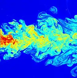 In fluid dynamics, turbulence or turbulent flow is fluid motion characterized by chaotic changes in pressure and flow velocity. It is in contrast to laminar flow, which occurs when a fluid flows in parallel layers with no disruption between those layers.[1]