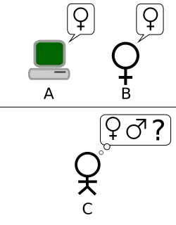Turing's original article describes a simple party game involving three players. Player A is a man, player B is a woman and player C (who plays the role of the interrogator) is of either sex. In the imitation game, player C is unable to see either player A or player B, and can communicate with them only through written notes. By asking questions of player A and player B, player C tries to determine which of the two is the man and which is the woman. Player A's role is to trick the interrogator into making the wrong decision, while player B attempts to assist the interrogator in making the right one.[7]