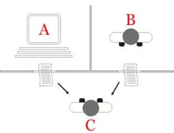 It is not difficult to devise a paper machine which will play a not very bad game of chess.[24] Now get three men A, B and C as subjects for the experiment. A and C are to be rather poor chess players, B is the operator who works the paper machine. ... Two rooms are used with some arrangement for communicating moves, and a game is played between C and either A or the paper machine. C may find it quite difficult to tell which he is playing.[25]