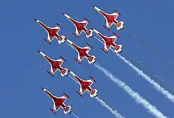 After a 20-year hiatus, the Turkish Air Force decided to establish an acroteam again and started activities to implement the project in 1992. In accordance with the directives of the Commander of the Turkish Air Force, Gen. Halis Burhan, work was started for the establishment of an acroteam in 1992 and approval was received for the establishment of an acroteam within the 132nd Weapon Tactics and Standardized Squadron Command at the Konya 3rd Main Jet Base on 11 September 1992. While the establishment and examination studies were continuing rapidly, the order to establish an acroteam consisting of four NF-5 wings within the 132nd Squadron was issued on 7 November 1992. In the meantime, the selection of the first four pilots who would constitute the core of the acroteam was made. In 1993, double training was started and the planned acrobatic movements were tried and the desired result was achieved after a flight of five sorties. Later, training of right and left wing fliers was started and quadruple training was started. In the meantime, some of the personnel working in the acroteam were sent to England, Canada and Italy to conduct research on the subject. In order to fulfill the acroteam duty with more safety and efficiency, a study was started on April 27, 1993, for the modifications to be made on the NF-5 aircraft, primarily the smoke system and painting of the aircraft, to increase flight safety. While the studies were ongoing, on June 18, 1993, the closing day of the Turkish Air Force Command Shooting Competitions, the Turkish Stars acroteam performed its first official display as a quartet to state dignitaries and other guests at the 4th Main Jet Base Command in Ankara. Following this display the Turkish Stars, which gained fleet status, managed to make a name for itself as the youngest supersonic acrobatic team in the world. In August 1993, the aircraft modification/painting activities were initiated by the 1st Main Jet Base Command and Maintenance Center Command in Eskişehir. During this process, five- and six-wing flight training was also initiated. The modifications and changes made to the 9 NF-5 and 1 NF-5B aircraft allocated to the Turkish Stars acroteam were completed in July 1994 and delivered to the unit.[40]