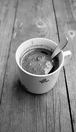 Turkish coffee is very finely ground coffee brewed by boiling. Any coffee bean may be used; arabica varieties are considered best, but robusta or a blend is also used.[1] The coffee grounds are left in the coffee when served.[2][3] The coffee may be ground at home in a manual grinder made for the very fine grind, ground to order by coffee merchants in most parts of the world, or bought ready-ground from many shops.