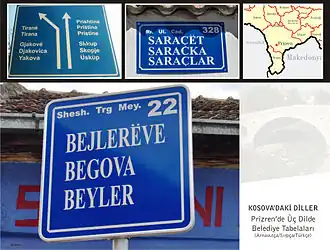 Right: Road signs in Prizren, Kosovo. Official languages are: Albanian (top), Serbian (middle) and Turkish (bottom).