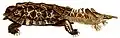 The shell of a turtle is unique among vertebrates and serves to protect the animal and provide shelter from the elements.[13][14][15] It is primarily made of 50–60 bones and consists of two parts: the domed, dorsal (back) carapace and the flatter, ventral (belly) plastron. They are connected by lateral (side) extensions of the plastron.[13][16]