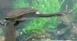 The necks of turtles are highly flexible, possibly to compensate for their rigid shells. Some species, like sea turtles, have short necks while others, such as snake-necked turtles, have long ones. Despite this, all turtle species have eight neck vertebrae, a consistency not found in other reptiles but similar to mammals.[33] Some snake-necked turtles have both long necks and large heads, limiting their ability to lift them when not in water.[26] Some turtles have folded structures in the larynx or glottis that vibrate to produce sound. Other species have elastin-rich vocal cords.[34][35]