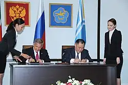 Tuva was a signatory to the 31 March 1992 treaty that created the Russian Federation. On 22 October 1993, a new constitution was drawn up for the republic, creating a 32-member parliament (Supreme Khural) and a Grand Khural, which deals with local legislation.[25] The constitution was approved by 53.9% (62.2% according to another source) of Tuvans in a referendum on 12 December 1993.[26] At the same time, the official name was changed from Tuva (Тува) to Tyva (Тыва).[27]