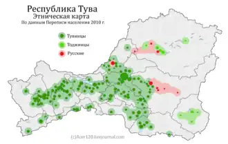 1. ^ Russian: Республика Тыва, romanized: Respublika Tyva, IPA: [rʲɪˈspublʲɪkə tɨˈva]; Tuvan: Тыва Республика, romanized: Tıva Respublika, IPA: [tʰɤ̀ʋɐ rʲɪ̀spúblʲɪkə]