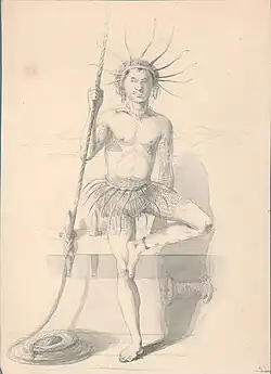 The United States Exploring Expedition under Charles Wilkes visited Funafuti, Nukufetau, and Vaitupu in 1841.[60] During this expedition, engraver and illustrator Alfred Thomas Agate recorded the dress and tattoo patterns of the men of Nukufetau.[61]