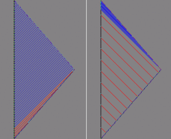 The x–t (space–time) diagrams at right show the paths of light signals travelling between Earth and ship (1st diagram) and between ship and Earth (2nd diagram). These signals carry the images of each twin and their age-clock to the other twin. The vertical black line is the Earth's path through spacetime and the other two sides of the triangle show the ship's path through spacetime (as in the Minkowski diagram above). As far as the sender is concerned, they transmit these at equal intervals (say, once an hour) according to their own clock; but according to the clock of the twin receiving these signals, they are not being received at equal intervals.