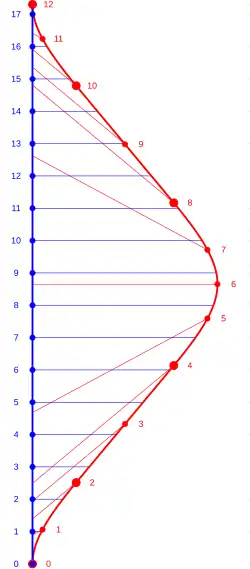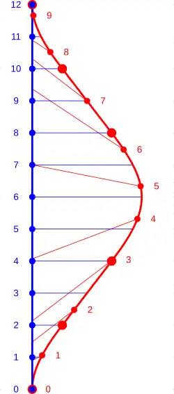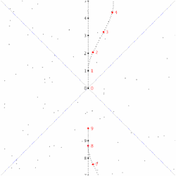 Animation illustrates the time difference between twins in the twin paradox. The black line is the world line of the stationary (or uniformly moving) twin. The red line is the world line of the accelerating and decelerating twin. The momentarily frame is co-moving along the world line of the accelerating and decelerating twin. The numbers show clocks of both twins. The clocks start simultaneously. When the twins meet again, the red clock (moving nonuniformly) is delayed compared to the black one (moving uniformly). The vertical direction indicates time, while the horizontal indicates distance, the dashed line is the spacetime of the observer. The small dots are specific events in spacetime.