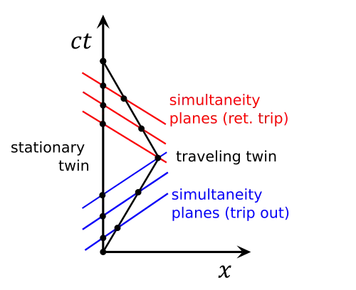 For a moment-by-moment understanding of how the time difference between the twins unfolds, one must understand that in special relativity there is no concept of absolute present. For different inertial frames there are different sets of events that are simultaneous in that frame. This relativity of simultaneity means that switching from one inertial frame to another requires an adjustment in what slice through spacetime counts as the "present". In the spacetime diagram on the right, drawn for the reference frame of the Earth-based twin, that twin's world line coincides with the vertical axis (constant position in space, moving only in time). On the first leg of the trip, the second twin moves to the right (black sloped line); and on the second leg, back to the left. Blue lines show the planes of simultaneity for the travelling twin during the first leg of the journey; red lines, during the second leg. Just before turnaround, the travelling twin calculates the age of the Earth-based twin by measuring the interval along the vertical axis from the origin to the upper blue line. Just after turnaround, when recalculating, the travelling twin will measure the interval from the origin to the lower red line. In a sense, during the U-turn the plane of simultaneity jumps from blue to red and very quickly sweeps over a large segment of the world line of the Earth-based twin. When one transfers from the outgoing inertial frame to the incoming inertial frame there is a jump discontinuity in the age of the Earth-based twin[22][23][27][29][30] (6.4 years in the example above).