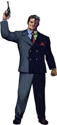 Two-Face has no superpowers, instead relying on his proficiency in marksmanship and martial arts, which was further improved after being trained by Deathstroke and Batman.[45] As a former lawyer, the character uses his expertise in criminal law, criminology, and police procedures to devise his crimes.[46][47]