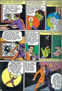 Two-Face was created by Batman co-creator Bob Kane,[1] and debuted in Detective Comics #66 ("The Crimes of Two-Face"), written by Batman's other co-creator Bill Finger, in August 1942 as a new Batman villain originally named Harvey "Apollo" Kent, a handsome, law-abiding former Gotham City district attorney close to the Batman. Half of his face was disfigured when a mob boss he was prosecuting, Sal Maroni, splashed Kent with acid, resulting in his loss of sanity and turn to crime, with his crimes centered around the number 2.[2][3][4][5] In creating Two-Face, Kane was inspired by the 1931 adaptation of the Robert Louis Stevenson story The Strange Case of Dr. Jekyll and Mr. Hyde, which Kane described as a "classic story of the good and evil sides of human nature",[6] and was also influenced by the 1925 silent film adaptation of Gaston Leroux's novel The Phantom of the Opera.[6] Kane and Finger conceived the idea of Two-Face flipping a coin scarred on one side to determine which side of his personality emerges: evil if the coin flip results in the scarred side, which causes him to "go on a rampage of looting and destruction",[6] or good if it results in the unscarred side, causing him to give his loot to charity or refrain from committing a crime.[6] In Kane's autobiography Batman and Me, Kane suggests that Finger was inspired by the pulp magazine hero Black Bat, with their similarities as both district attorneys disfigured with acid.[6] Two-Face's last name Kent was later changed to Dent, which Kane infers was done to avoid confusion with Superman's alter ego Clark Kent.[6]