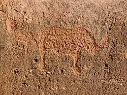 Additionally, the site contains rock paintings at 13 different locations, with depictions of humans painted in red ochre in six rock shelters. The similar occurrence of rock paintings and rock engravings is very rare.[4][15]