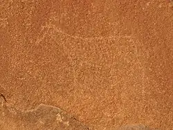 Engravings of animals that certainly never occurred in this area, like a sea lion,[17] penguins,[16] and possibly flamingos[18] indicate that the hunter-gatherers might have ventured to the coast more than 100 km (62 mi) away. A modern archaeological survey led by Sven Ouzman questions these descriptions of Scherz' initial investigation and describes the not easily recognisable fauna as "strange animals"—rough work of animals, possibly giraffe, that did occur at Twyfelfontein.[16]