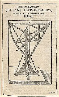The instruments he had used in Uraniborg and Stjerneborg were depicted and described in detail in his star catalogue Astronomiae instauratae mechanica or Instruments for the restoration of astronomy, first published in 1598. The King sent two envoys to Hven to describe the instruments left behind by Tycho. Unversed in astronomy, the envoys reported to the king that the large mechanical contraptions such as his large quadrant and sextant were "useless and even harmful".[50][51]