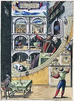 The basement of Uraniborg included an alchemical laboratory, with 16 furnaces for conducting distillations and other chemical experiments.[34] Unusually for the time, Tycho established Uraniborg as a research centre, where almost 100 students and artisans worked from 1576 to 1597.[35] Uraniborg contained a printing press and a paper mill, both among the first in Scandinavia, enabling Tycho to publish his own manuscripts, on locally made paper with his own watermark. He created a system of ponds and canals to run the wheels of the paper mill.[36] Another resident of Uraniborg was a man with dwarfism named Jeppe, whom Tycho believed had the ability to predict the future, and he allegedly was able to correctly predict the chances of recovery or death of ill people in Hven.[37]