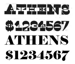 - ^ Specimens of type, borders, ornaments, brass rules and cuts, etc. : catalogue of printing machinery and materials, wood goods, etc. American Type Founders. 1897. p. 703. Retrieved 17 August 2015.