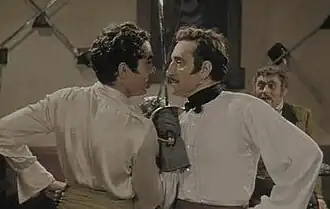In 1940, the direction of Power's career took a dramatic turn with The Mark of Zorro. Power played the role of Don Diego Vega/Zorro, fop by day, bandit hero by night. The film was a hit, leading 20th Century-Fox to cast Power in other swashbucklers going forward. Power was a talented swordsman in real life, and the dueling scene in The Mark of Zorro is highly regarded. The great Hollywood swordsman, Basil Rathbone, his co-star in The Mark of Zorro, commented, "Power was the most agile man with a sword I've ever faced before a camera. Tyrone could have fenced Errol Flynn into a cocked hat."[17]