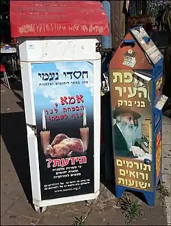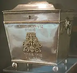 Both Jewish homes[20] and synagogues have a charity collection box into which cash is placed. At home, particularly before the woman of the house lights her Sabbath candles, it is a way of setting aside money. In the synagogue, a designated individual circulates (and shakes it to announce this opportunity).