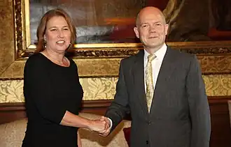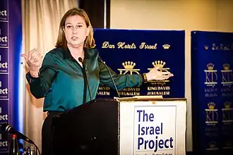 A former member of the Knesset and leader in the center-left political camp, Livni is a former foreign minister, vice prime minister, minister of justice, and leader of the opposition. She is known by some for her efforts to resolve the Israeli–Palestinian conflict.[2][3]