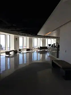 In July 2014, OUE Ltd. (OUE), the new owners of the skyscraper, announced construction of an observation deck named OUE Skyspace.[24] on the 69th and 70th floors and a restaurant named 71Above on the 71st floor.[25] The facilities opened on June 24, 2016,[26] following remodeling and construction costing $31 million[27] that included a makeover of the ground floor lobby as well as a separate second floor entrance for tourists, and a skylobby and exhibit hall on the 54th floor. Access to the observation deck cost $25 per person.[28] For an additional $8, visitors could take a trip down a transparent glass slide affixed to the outside of the building between the 70th and 69th floors known as the Skyslide.[29]