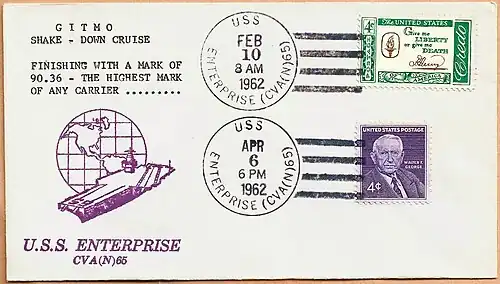 ![]() USS Enterprise, official postmark and cachet mailed during Guantanamo (GITMO) Shake Down Cruise 10 February 1962 |