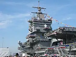 Enterprise[12] was, at the time of inactivation, the third-oldest commissioned vessel in the United States Navy after the wooden-hulled USS Constitution and USS Pueblo (AGER-2).[13] She was inactivated on 1 December 2012,[14] and officially decommissioned on 3 February 2017,[15][16] after over 55 years of service.[17][18] She was stricken from the Naval Vessel Register the same day.[3] The name has been adopted by the future Gerald R. Ford-class aircraft carrier USS Enterprise (CVN-80).[19][20]