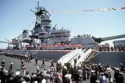 After an overhaul in the New York Naval Shipyard[38] that included the replacement of the Mark 8 fire-control radars with Mark 13 models,[39] and a training cruise to Cuba, Missouri returned to New York. During the afternoon of 21 March 1946, she received the remains of the Turkish Ambassador to the United States, Munir Ertegun. She departed on 22 March for Gibraltar, and on 5 April anchored in the Bosphorus off Istanbul. She rendered full honors, including the firing of 19-gun salutes during the transfer of the remains of the late ambassador and again during the funeral ashore.[17][40] The arrival of the ship was one of the causes of the Turkish Straits crisis betweet Turkey and the Soviet Union.[41]