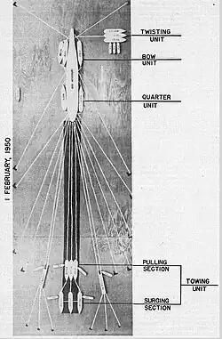 Captain William D. Brown assumed command of the battleship on 10 December while she was being overhauled.[48] Then the only US battleship in commission, Missouri was proceeding from Hampton Roads on her first training exercise at sea since the overhaul, early on 17 January 1950 when she ran aground 1.6 mi (2.6 km) from Thimble Shoal Light, near Old Point Comfort. She hit shoal water a distance of three ship-lengths from the main channel.[17] The error resulted from a combination of many factors, including Brown's inexperience maneuvering such a large ship. The grounding occurred during a particularly high tide making the effort to free her even more difficult as did having an abandoned anchor becoming embedded in her hull. After off-loading ammunition, fuel and food to lighten the battleship,[49] she was refloated on 1 February with the aid of tugboats, pontoons, beach gear and a rising tide.[50]