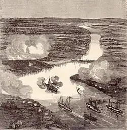 On 8 March 1862, Virginia, commanded by Commander Franklin Buchanan,[90] was ready to engage the Union flotilla blockading the James River.[g] Virginia was powered by Merrimack's original engines, which had been condemned by the US Navy before her capture. The ship's chief engineer, H. Ashton Ramsay, served in Merrimack before the Civil War broke out and knew of the engines' unreliability, but Buchanan pushed forward undaunted.[92][h]