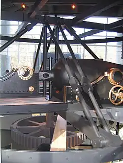 The ship was powered by a two-cylinder horizontal vibrating-lever steam engine,[29] also designed by Ericsson, which drove a 9-foot (2.7 m) propeller,[27] whose shaft was nine inches in diameter.[30] The engine used steam generated by two horizontal fire-tube boilers[31] at a maximum pressure of 40 psi (276 kPa; 3 kgf/cm2).[32] The 320-indicated-horsepower (240 kW) engine was designed to give the ship a top speed of 8 knots (15 km/h; 9.2 mph), but Monitor was 1–2 knots (1.9–3.7 km/h; 1.2–2.3 mph) slower in service.[29] The engine had a bore of 36 inches (914 mm) and a stroke of 22 inches (559 mm).[28] The ship carried 100 long tons (100 t) of coal.[29] Ventilation for the vessel was supplied by two centrifugal blowers near the stern, each of which was powered by a 6-horsepower (4.5 kW) steam engine. One fan circulated air throughout the ship, but the other one forced air through the boilers, which depended on this forced draught. Leather belts connected the blowers to their engines and they would stretch when wet, often disabling the fans and boilers. The ship's pumps were steam operated and water would accumulate in the ship if the pumps could not get enough steam to work.[27]