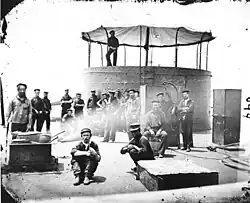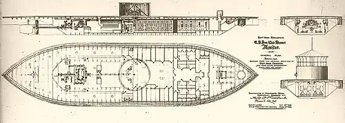 Monitor's turret measured 20 ft (6.1 m) in diameter and 9 ft (2.7 m) high, constructed with 8 inches (20 cm) of armor (11 inches in front at the gun ports) rendering the overall vessel somewhat top heavy. Its rounded shape helped to deflect cannon shot.[33][34] A pair of steam-powered donkey engines rotated the turret through a set of gears; a full rotation was made in 22.5 seconds during testing on 9 February 1862.[35] Fine control of the turret proved to be difficult; as there was no brake the steam engines would have to be placed in reverse if the turret overshot its mark, or another full rotation would have to be made. The only way to see out of the turret was through the gun ports; when the guns were not in use, or withdrawn for reloading during battle, heavy iron port stoppers would swing down into place to close the gunports.[36] Including the guns, the turret weighed approximately 160 long tons (163 t); the entire weight rested on an iron spindle that had to be jacked up using a wedge before the turret could rotate.[37] The spindle was 9 inches (23 cm) in diameter which gave it ten times the strength needed in preventing the turret from sliding sideways.[38] When not in use, the turret rested on a brass ring on the deck that was intended to form a watertight seal. In service, however, this proved to leak heavily, despite caulking by the crew.[37] The gap between the turret and the deck proved to be a problem as debris and shell fragments entered the gap and jammed the turrets of several Passaic-class monitors, which used the same turret design, during the First Battle of Charleston Harbor in April 1863.[39] Direct hits on the turret with heavy shot could bend the spindle, which could also jam the turret.[40] To gain access to the turret from below, or to hoist up powder and shot during battle, the turret had to rotate to face starboard, which would line up the entry hatch in the floor of the turret with an opening in the deck below.[41][42] The roof of the turret was lightly built to facilitate any needed exchange of the ship's guns and to improve ventilation, with only gravity holding the roof plates in place.[43]