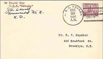 Nevada, then under command of Luke McNamee (4 May 1920 – 19 September 1921),[35] and with the battleship Arizona, represented the United States at the Peruvian Centennial Exposition in July 1921.[50] A year later, with Douglas E. Dismukes (11 October 1921 – 30 December 1922)[35] in command, and in company with Maryland this time, Nevada returned to South America as an escort to the steamer Pan America with Secretary of State Charles Evans Hughes embarked; they all attended the Centennial of Brazilian Independence in Rio de Janeiro, celebrated from 5 to 11 September 1922.[1][51][52] The New York Times later credited the crew of Nevada for bringing baseball and that sport's unique terminology to Brazil, allowing the country to "make the Yankee game an institution of their own".[53] At the end of 1922, John M. Luby (30 December 1922 – 7 September 1924) assumed command.[35] Three years later, then under command of David W. Todd (7 September 1924 – 11 June 1926),[35] Nevada took part in the US Fleet's "goodwill cruise" to Australia and New Zealand, from July–September 1925. During this cruise, the ships had only limited replenishment opportunities, but they still made it to Australia and back without undue difficulty.[54] This demonstrated to those allies and Japan that the US Navy had the ability to conduct transpacific operations[1] and meet the Imperial Japanese Navy in their home waters,[54] where both Japanese and American war plans expected the "decisive battle" to be fought, if it should come.[55]