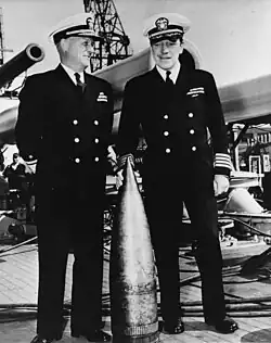 At 14:47, an unexploded 24 cm shell was reported.[66] The shell crashed through the port bow directly below the Wardroom and entered the stateroom of Warrant Officer M.A. Clark, but failed to explode. The unexploded shell was later disarmed by a Navy bomb disposal officer in Portsmouth and is currently displayed aboard the ship. Throughout the three-hour duel, the Germans straddled and near-missed Texas over sixty-five times, but she continued her mission firing 206 fourteen-inch shells at Battery Hamburg until ordered to retire at 15:01.[61][62]