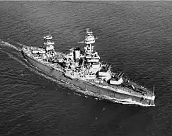 She returned to New York early in 1929 for her annual overhaul and had completed it by March when she began another brief tour of duty in the Pacific. She returned to the Atlantic in June and resumed normal duty with the Scouting Fleet. In April 1930, she took time from her operating schedule to escort Leviathan into New York when that ship carried the returning U.S. delegation to the London Naval Conference. In January 1931, she left the yard at New York as flagship of the United States Fleet and headed via the Panama Canal to San Diego, California, and then on to Los Angeles (port of San Pedro) which became her home port for the next six years and three months.[42][43] There would be a temporary redeployment back to the Atlantic from April to October 1934.[44] During this Pacific period, she served first as flagship for the entire Fleet and, later, as flagship for Battleship Division 1.[9]