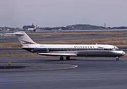 Allegheny's first jet was the Douglas DC-9 in 1966; it absorbed Lake Central Airlines in 1968 and Mohawk Airlines in 1972 to become one of the largest carriers in the northeastern United States. In 1973 it was the ninth-largest airline in the free world by passengers carried (and 24th largest by passenger-miles).[17] With expansion came growing pains: in the 1970s Allegheny had the nickname "Agony Air".[18]