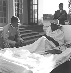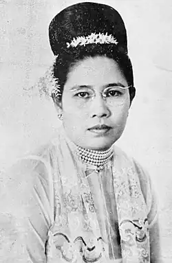Nu's political life started as president of the Rangoon University Students Union (RUSU) with M. A. Rashid as vice-president and U Thi Han as the general secretary. Aung San was editor and publicity officer. Nu and Aung San were both expelled from the university after an article, Hell Hound at Large, appeared in the union magazine, which was obviously about the rector.[2] Their expulsion sparked off the second university students' strike in February 1936. Aung San and Nu became members of the nationalist Dobama Asiayone (Our Burma Association) which had been formed in 1930 and henceforth gained the prefix Thakin ('Master'), proclaiming they were the true masters of their own land. For a few years after independence in 1948 Nu retained the prefix 'Thakin', but around 1952 he announced that since Burma was already independent the prefix of 'Thakin' was no longer needed and henceforth he would be known as U ('Mr') Nu. In 1937 he co-founded with Thakin Than Tun the Nagani (Red Dragon) Book Club which for the first time widely circulated Burmese-language translations of the Marxist classics. He also became a leader and co-founder of the People's Revolutionary Party (PRP), which later became the Socialist Party, and the umbrella organisation the Anti-Fascist People's Freedom League (AFPFL), which advocated Burmese independence from both Japanese and British control during the 1940s. He was detained by the colonial government in 1940 along with Thakin Soe, Thakin Than Tun, Kyaw Nyein, U Măd, and Ba Maw. The prison holding Nu was largely abandoned by the British in the course of the rapid Japanese advance.[3]