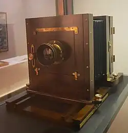It was only after his contact with Swiss photographer Pierre Rossier (1829 – ca. 1890) that Ueno decided to pursue a career as a photographer. Rossier had been commissioned by the firm Negretti and Zambra to photograph in Asia and he worked in Japan from 1859 to 1860. He was only in Nagasaki for a short time, but while there he taught wet-collodion process photography to Ueno, Horie Kuwajirō (1831–1866), Maeda Genzō (1831–1906) and others. Soon after, Ueno's friend Horie bought a wet-plate camera. The purchase, which included photographic chemicals, was funded by the daimyō of Tsu Domain, Tōdō Takayuki, and the price was 150 ryō. Apparently the photographic equipment was of such interest to Ueno that he chose to become a subject of the Tsu Domain in order to have access to it at the domainal residence in Edo.[3] and in 1861 Horie photographed Ueno at work in the domain's laboratory in Edo (now Tokyo).[4] In 1862 Ueno and Horie co-wrote a textbook titled Shamitsu Kyoku Hikkei that comprised translated extracts from ten Dutch science manuals and which included an appendix titled Satsueijutsu [The Technique of Photography] that described techniques of collodion process photography as well as Nicéphore Niépce's asphalt printing method.[e][4]