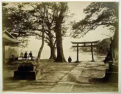 Ueno himself taught many important nineteenth-century photographers, including Uchida Kuichi (1844–1875), Tomishige Rihei,[h] [7] Kameya Tokujirō,[i] [7] (1837–1922), Nakajima Shinzō, Nagai Nagayoshi, Noguchi Jōichi, Nakajima Seimin, Tanaka, Morita Raizō, Kikizu Maturoku, and Ueno Yoshima. Ueno maintained a close relationship with Uchida, and following the latter's trip to Nagasaki in 1872 while photographing for the Emperor Meiji their albums include several identical images that they presumably exchanged.[8] Eventually, Ueno opened branches of his photographic studio in Vladivostok in 1890 and in Shanghai and Hong Kong in 1891.
