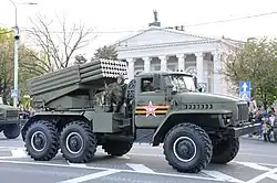 Meanwhile, a plan to destroy the Lukaya causeway was presented to Amin in Kampala, but he rejected it, saying that it would inhibit his army's ability to launch a counteroffensive against the Tanzanians. He also believed that with Libyan support the TPDF would soon be defeated, and thus destroying and then rebuilding the causeway later would be unnecessary.[80] On 2–4 March, the Uganda Army defeated a rebel attack during the Battle of Tororo, heartening Amin. Along with his commanders' urgings, the victory at Tororo persuaded the President to order a counter-offensive.[137] On 9 March over 1,000 Libyan troops[134] and about 40 PLO guerrillas belonging to Fatah were flown into Uganda.[81] The Libyan force included regular units, sections of the People's Militia, and members of the Pan-African Legion.[138][139] They were accompanied by 15 T-55 tanks, over a dozen armoured personnel carriers, multiple Land Rovers equipped with 106 mm (4.2 in) recoilless rifles, one dozen BM-21 Grad 12-barrel Katyusha rocket launcher variants,[134][140][138] and other large artillery pieces, such as 122 mm (4.8 in) mortars[17] and two batteries of D-30 howitzers.[140] Over the course of the war a total of 4,500 Libyan troops were deployed in Uganda.[141] Amin ordered the Libyans, together with some Ugandan troops and PLO guerrillas, to recapture Masaka.[134][142]