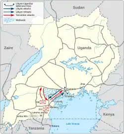 War broke out between Uganda and Tanzania in October 1978, with several Ugandan attacks across the border culminating in an invasion of the Kagera Salient.[13] The circumstances surrounding the outbreak of the war are not clear,[10] and numerous differing accounts of the events exist.[14] Obote wrote that the decision to invade Kagera was "a desperate measure to extricate Amin from the consequences of the failure of his own plots against his own army."[15] Several Uganda Army soldiers blamed Lieutenant Colonel Juma Butabika for starting the war,[16] including Colonel Abdu Kisuule, who accused Butabika of engineering an incident at the border to create a pretext for invading Tanzania.[17] According to Amin's son, Jaffar Remo, rumours of a potential Tanzanian invasion led members of the Ugandan high command to call for a preemptive attack on Tanzania.[18] The Tanzanian military later argued that Amin's ultimate aim was to annex a large part of northern Tanzania, including the city of Tanga, in order to gain access to the sea for trading purposes. Ugandan journalist Faustin Mugabe found no evidence for this theory in Ugandan sources.[19]