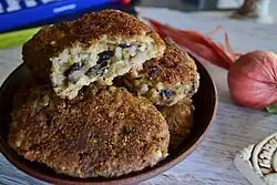 - Kotlety or sichenyky (cutlets, meatballs): minced meat or fish mixed with onions, raw eggs, breadcrumbs or bread, and sometimes garlic and milk, fried in oil and sometimes rolled in breadcrumbs.