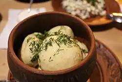 - Potato (kartoplia, also dialectally barabolia, bulba, krumplia, mandeburka): young or peeled, served with butter, sour cream, dill; a more exclusive variety includes raw egg. May be boiled, fried, baked, or mashed.