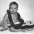 Boy in Hawaii with a Maccaferri 'Islander' plastic ukulele, 1959