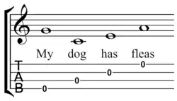 One of the most common tunings for the standard or soprano ukulele is C6 tuning: G4–C4–E4–A4, which is often remembered by the notes in the "My dog has fleas" jingle (see sidebar).[59] The G string is tuned an octave higher than might be expected, so this is often called "high G" tuning. This is known as a "reentrant tuning"; it enables uniquely close-harmony chording.