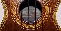 The soundhole and label of a ukulele made in the 1920s by Louis Viohl & Sons in Flushing, Queens, New York City.