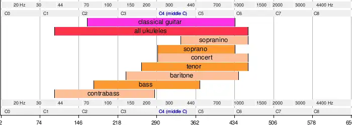 The following chart shows the range of notes of standard ukulele types. Note that the range varies with the tuning and size of the instruments. The examples shown in the chart reflect the range of each instrument from the lowest standard tuning to the highest fret in the highest standard tuning.