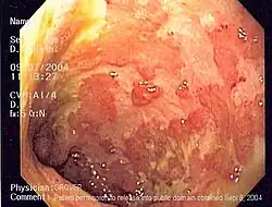 | Endoscopic image of a colon affected by ulcerative colitis. The internal surface of the colon is blotchy and broken in places. Mild-moderate disease. | |